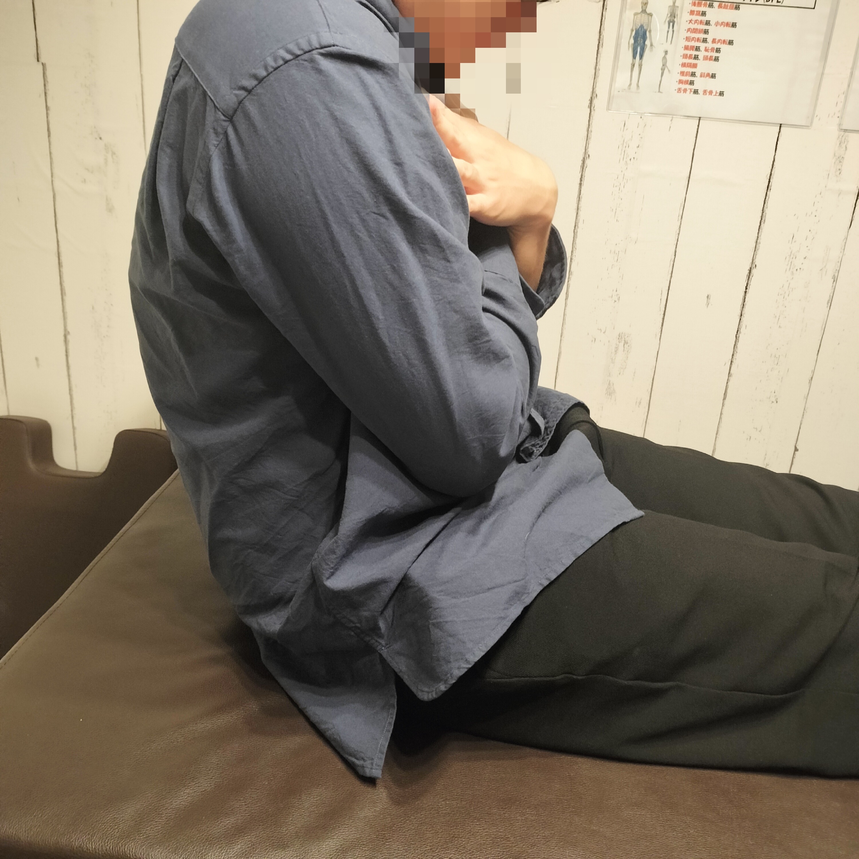 さらに、デスクワーク時の姿勢を再現しながら、どの体勢で症状が出やすいかを確認したところ、背中が丸まり骨盤が後ろに倒れた姿勢でしびれが増強。これは、腰椎や筋肉への負担が高まり、坐骨神経を走るルートにストレスが集中しているサインでもあります。