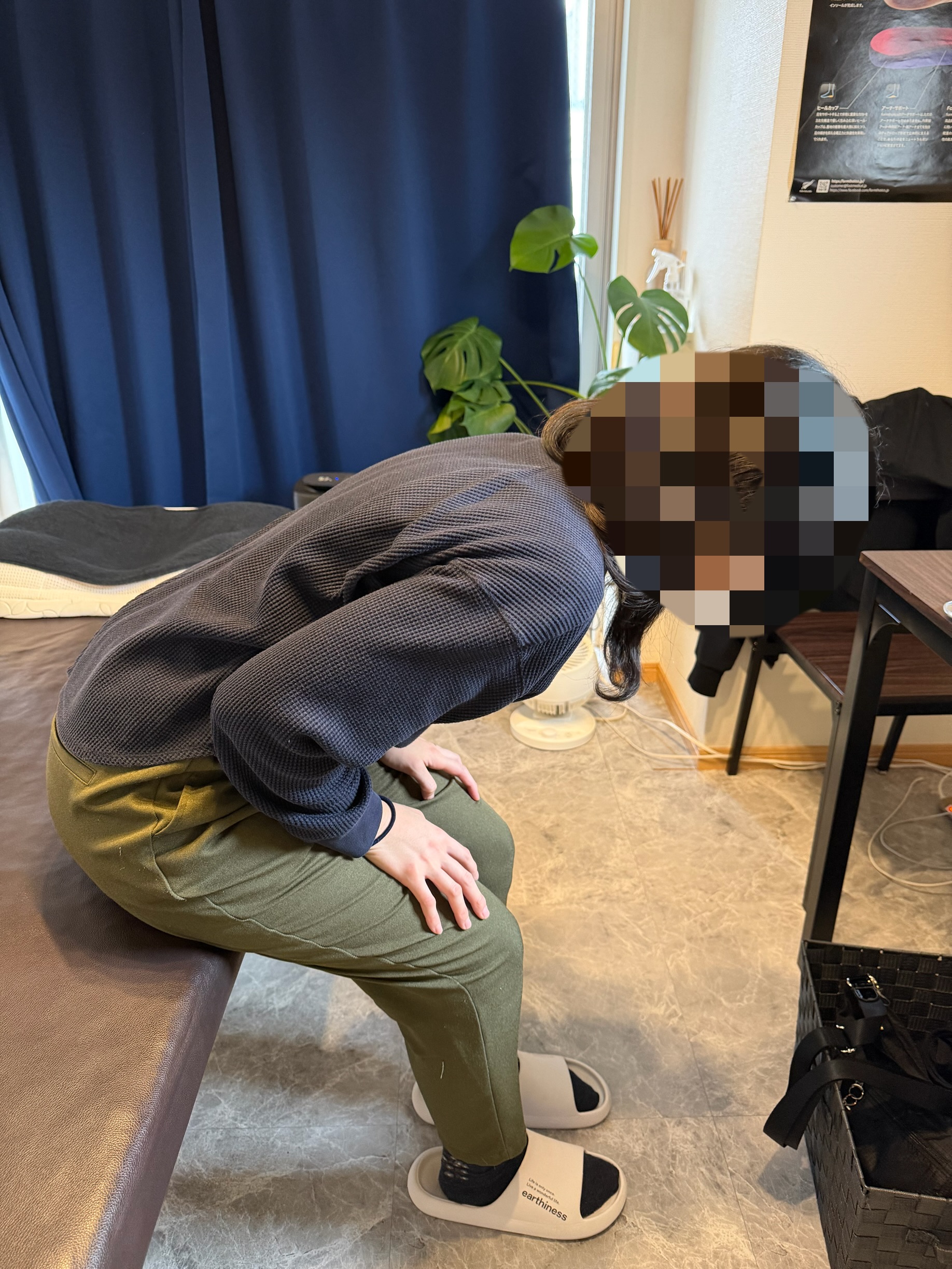 初回評価では、現在感じている腰の痛みや下肢への違和感だけでなく、日常生活の中でどの動作が負担になっているのか、また今後どのように過ごしていきたいかについて丁寧に確認しました。痛みを避ける生活が続いていたことで、動作全体が慎重になり、腰部に過度な緊張が生じている様子がうかがえました。